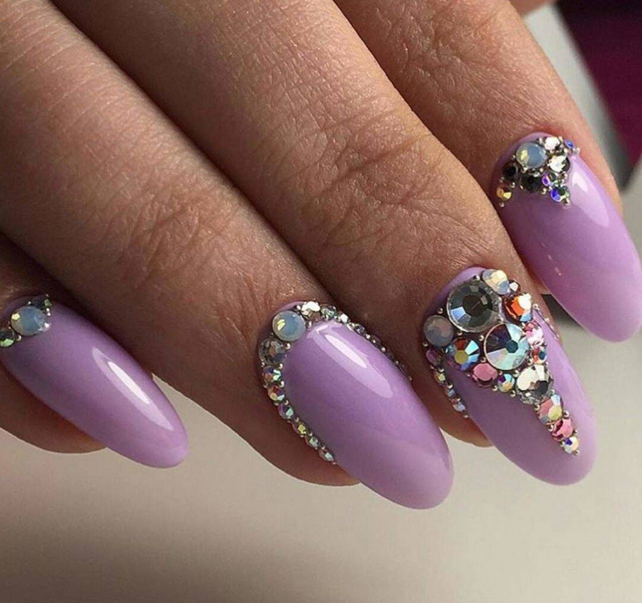 - выкладка стразами разного размера – композицию создает либо сам мастер маникюра, либо используются готовые наклейки с уже готовыми наборами страз