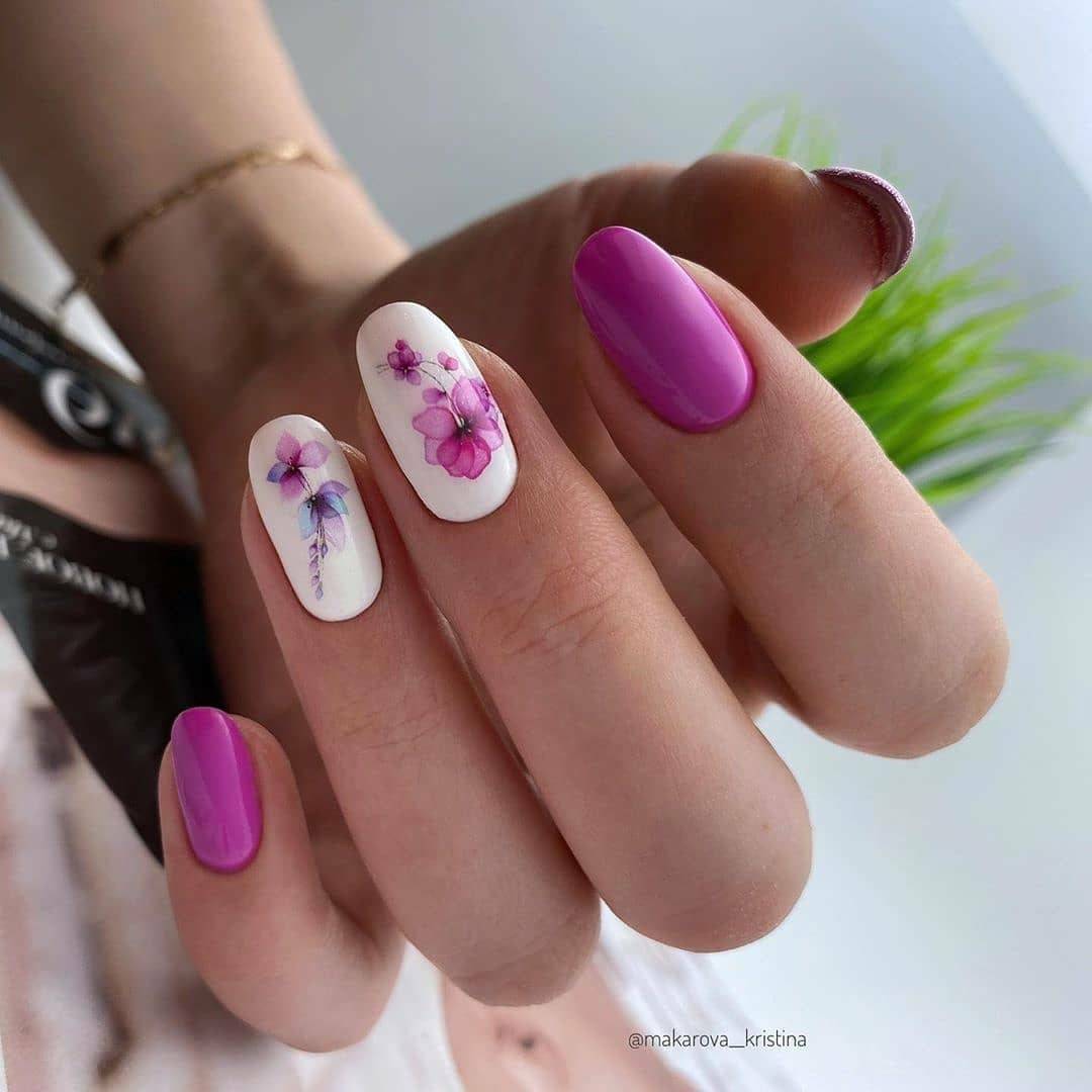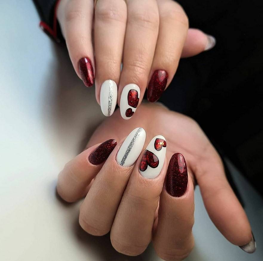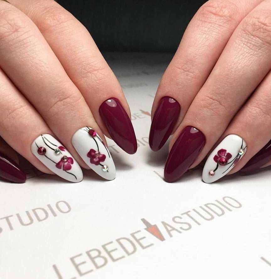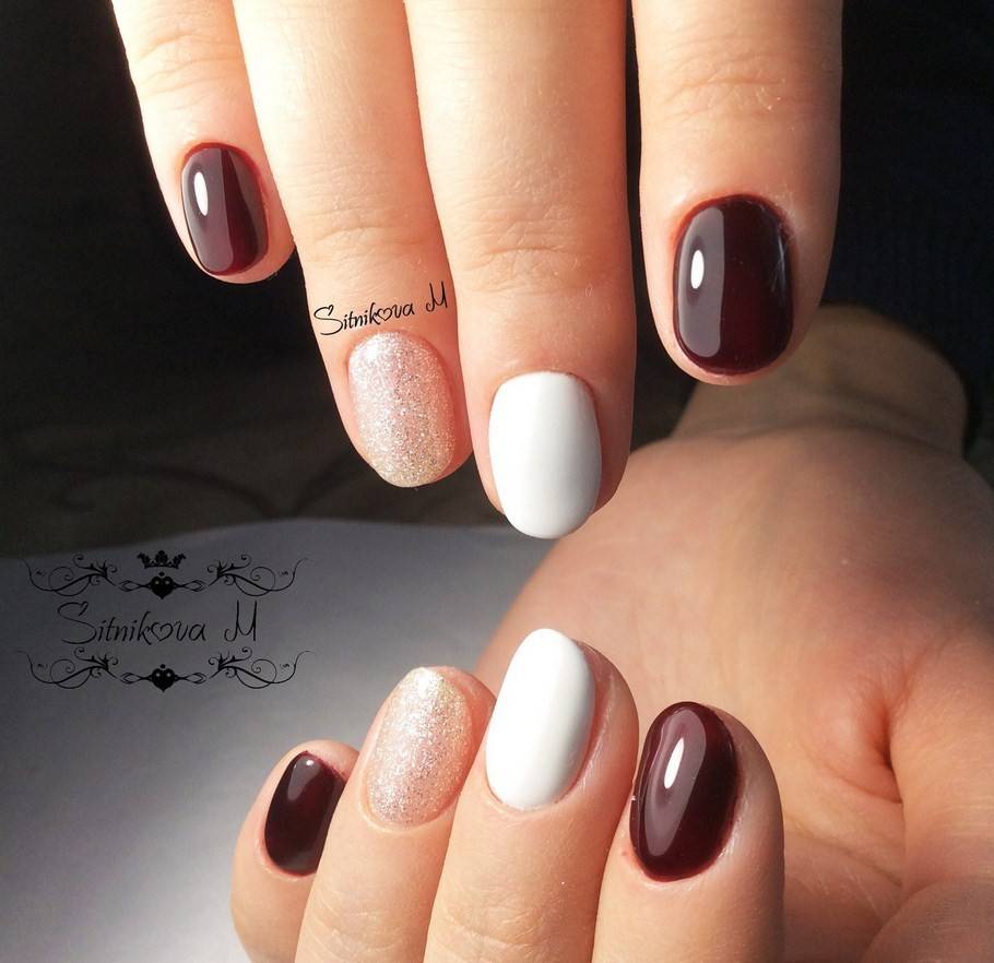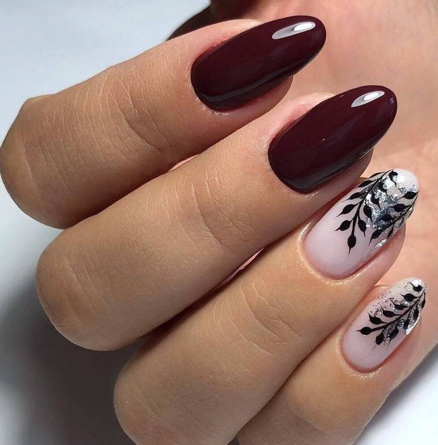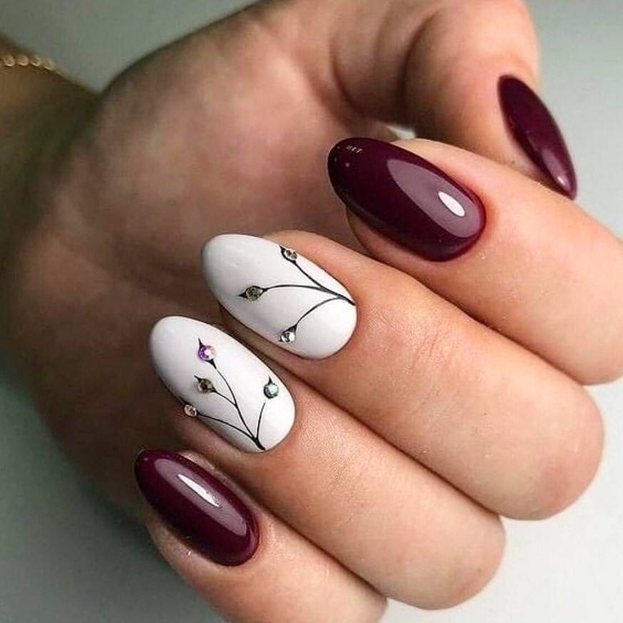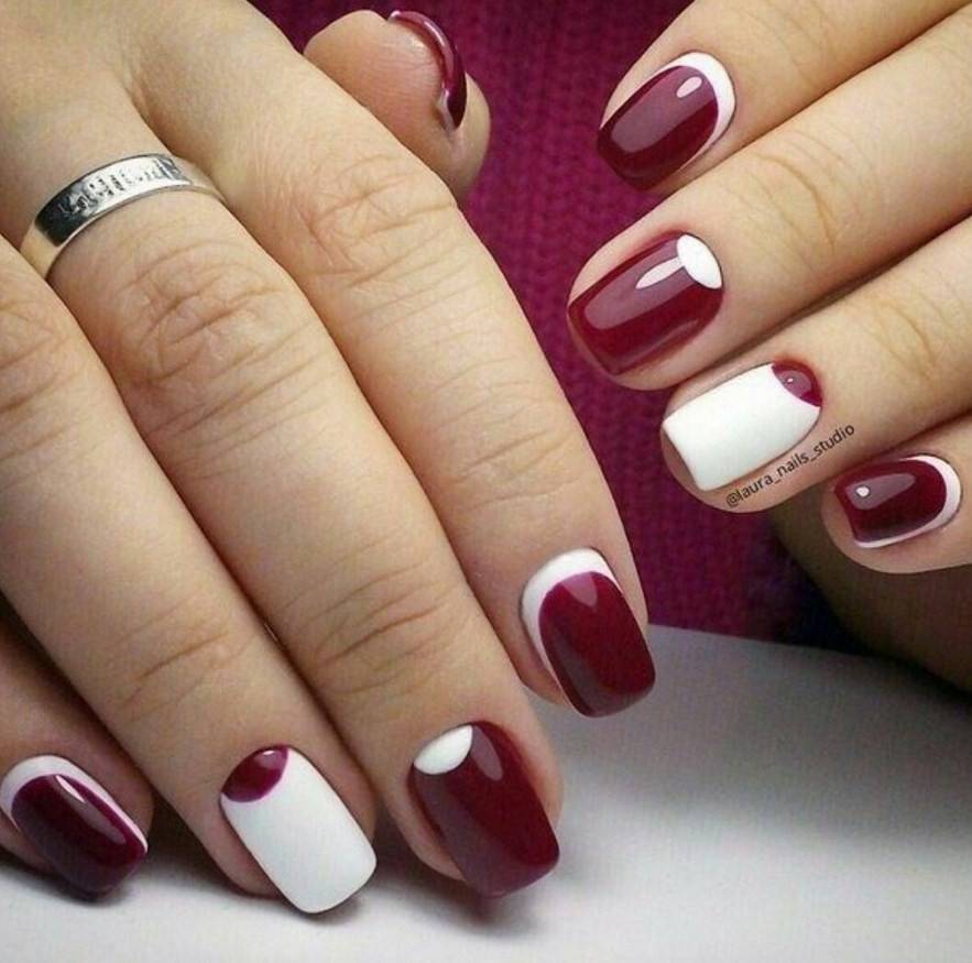 Сделать нейл-дизайн нежным и чувственным можно с помощью добавления белого цвета. Он разбавит насыщенность тёмного оттенка и придаст ему больше изысканности. Особенно хорошо такой дуэт смотрится на длинных ногтях, если использовать оба оттенка примерно в равных пропорциях. Чтобы разнообразить стиль, можно заменить белый на молочный и применять мраморный дизайн.