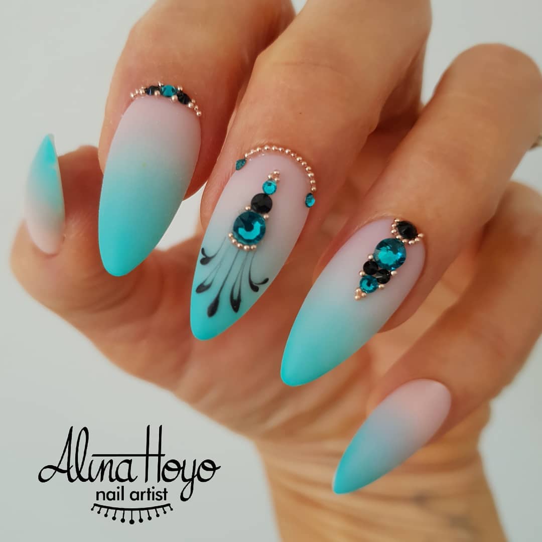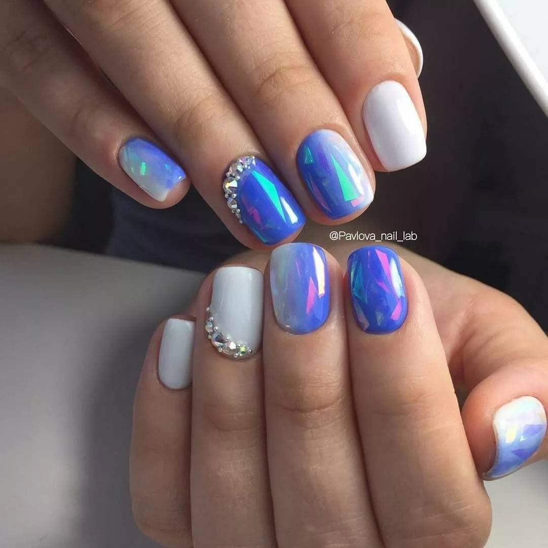 - Голубой. Этот цвет занимает «пальму первенства». Его украшают стразами, блестками, делают на нем рисунки, присыпают пудрой.