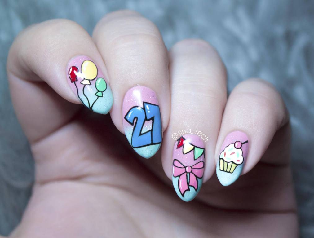 День рождения – отличный повод создать оригинальный дизайн ногтей. Для молодой девушки подойдут нейл-арты с цифрами, пожеланиями и другим оригинальным декором. Используйте нежные пастельные оттенки, блестящий декор пайетками, стразами, фольгой. Используйте инкрустацию стразами, глиттер на одной ноготке и другие переливающиеся текстуры.