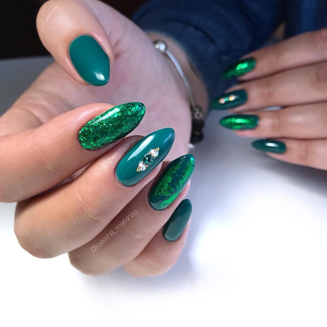 - Зелёные. Палитра зелёного столь разнообразна, что каждая девушка может подобрать свой идеальный оттенок. Тёмно-зелёный характерен осенне-зимнему сезону, светлые тона – для весны и лета. Все зелёные оттенки хороши в градиентной технике.