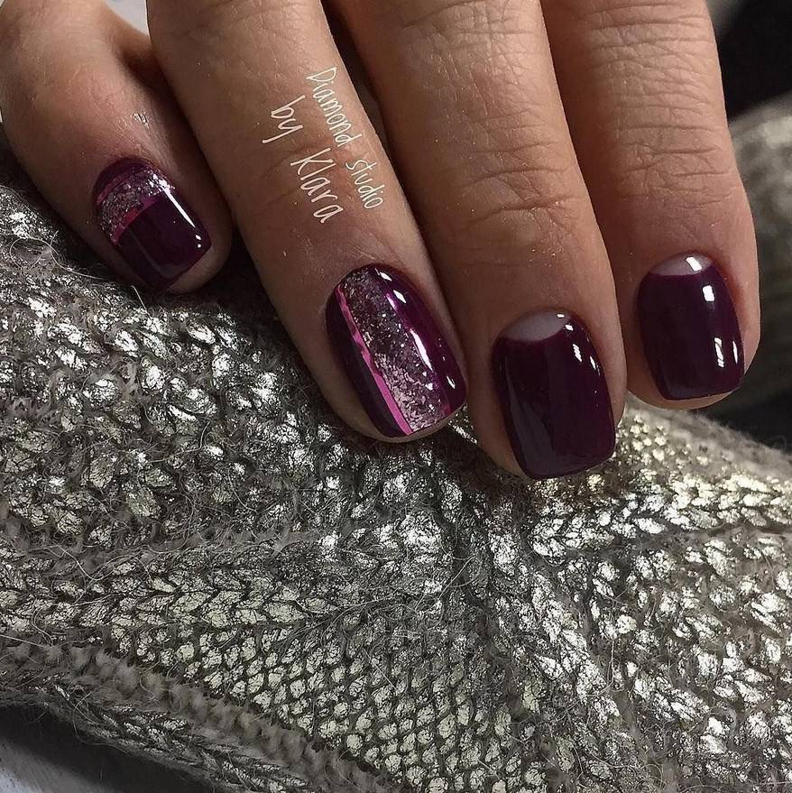 Серебристые переливы, полоски, абстракция, прорисовка лунок или улыбок френча – возможные варианты оформления ноготков вкупе с бордовыми тонами.
