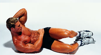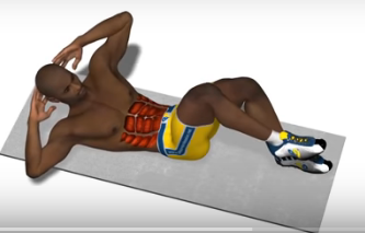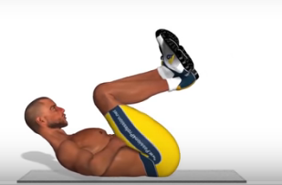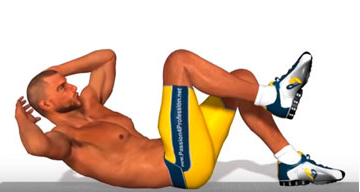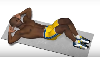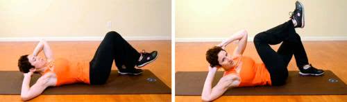 Необходимо заложить руки за голову и поочередно дотягиваться левым локтем к правому колену, а затем правым к левому. Коленом нужно стараться дотянуться до соответствующего локтя.