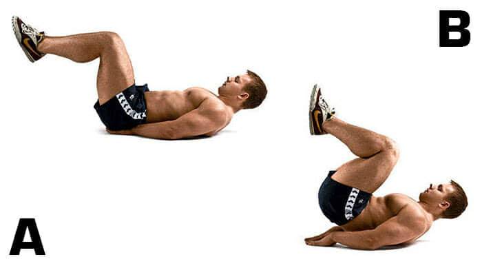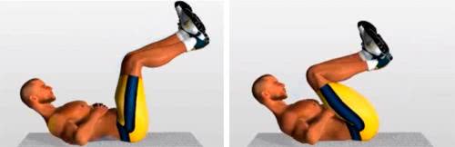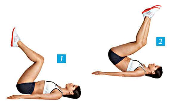 Толчки ногами. Руки вытянуть вдоль тела ладонями вниз или подложить их под ягодицы. Слегка согнутые ноги нужно поднимать и толкать их вверх. Можно сложить ноги крестом, главное — поднимать их максимально высоко, так эффект будет более явным. В этом упражнении верхняя часть тела должна быть зафиксирована.