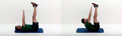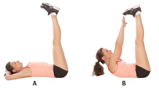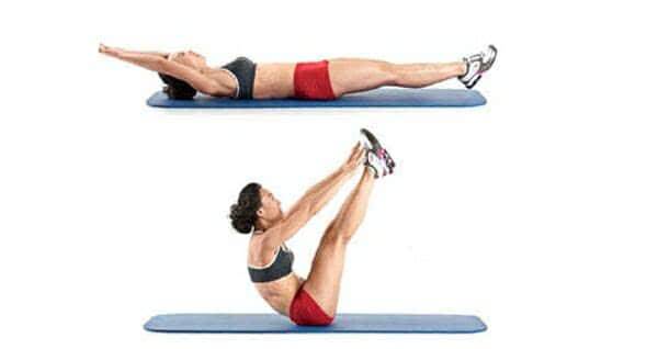 Нужно лежа на спине поднять ровные ноги (или согнутые под углом 90 градусов) и дотянуться обеими руками до носков. Во время выполнения упражнения должна подниматься и опускаться только верхняя часть тела.