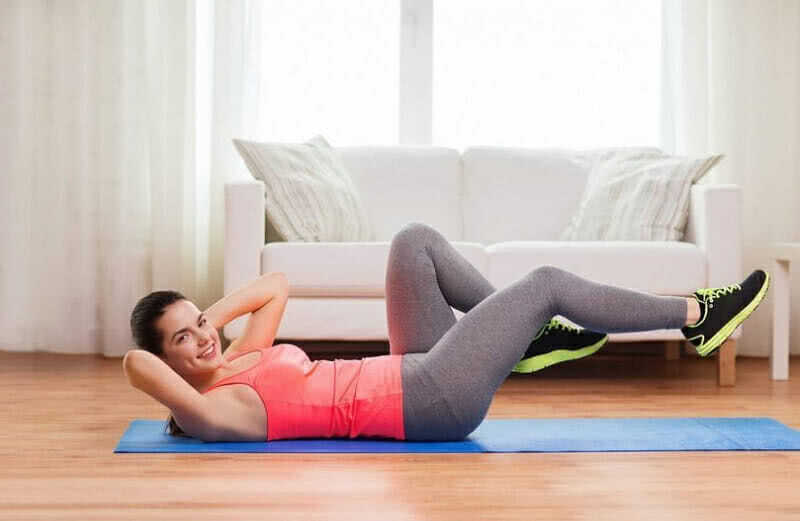 Лежа на полу необходимо поместить руки на пресс, а ноги поставить на пол. В таком положении нужно поднимать туловище