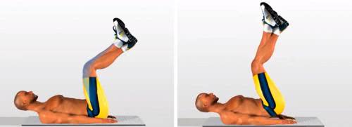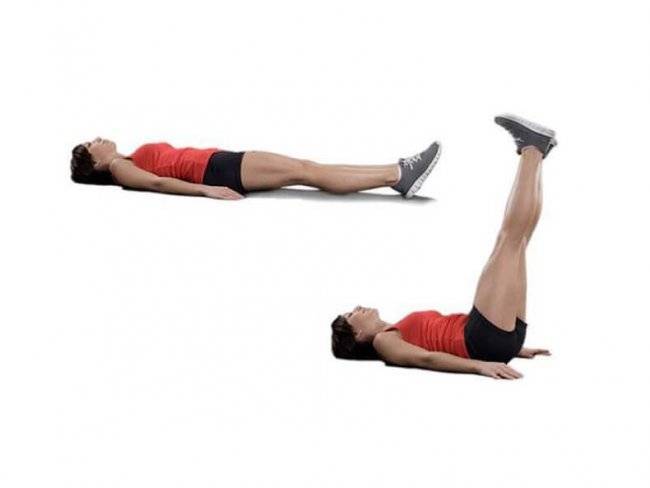 Лежа на полу, руки вдоль туловища, ладонями вниз, ноги вместе. Голова лежит на полу, ее поднимать не рекомендуется. Необходимо поднимать обе ноги в диапазоне 45–60 градусов, ненадолго задерживаясь в таком положении, и опускать обратно.