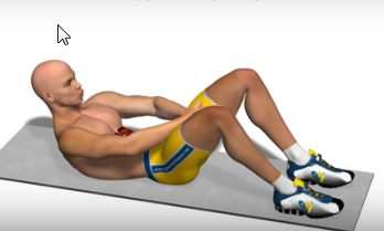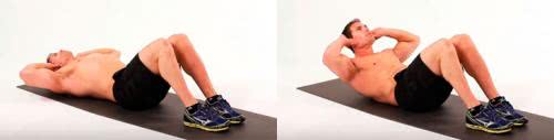В положении лежа согнуть ноги и поставить их на пол на ширине плеч. Скрестить ладони и начать приподнимать верхнюю часть туловища рывками, направляя руки между ног. Нужно контролировать, чтобы подбородок не прижимался к груди, а голова не запрокидывалась назад