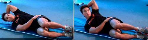 Находясь в горизонтальном положении, необходимо попытаться локтем дотронуться до левого колена, при этом рука должна находиться за головой