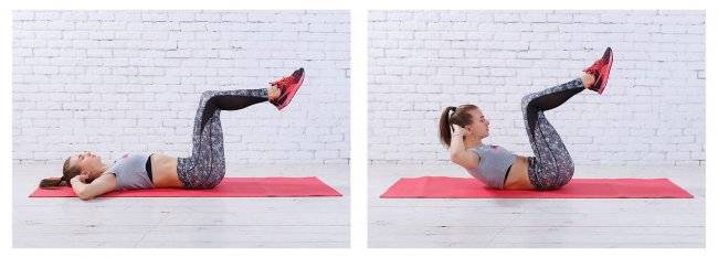 В положении лежа пытаемся правым локтем коснуться левого колена, рука находится за головой. Ногу нужно сгибать и разгибать, при этом ни в коем случае не опускаем ее не пол, ведь только в этом случае упражнение будет эффективным. Вторая рука лежит за головой или на животе, это позволит ощущать работу мышц. Старайтесь, чтобы амплитуда ваших движений была как можно больше.