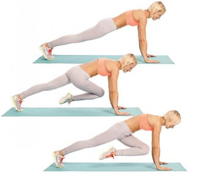 Попеременные скручивания. Лечь на спину и сложить руки за голову так, чтобы ладони лежали на затылке. Ноги согнуть в коленях, чтобы стопы стояли на расстоянии 30-40 см от ягодиц. Нужно плавно поднимать верхнюю часть тела и правым локтем касаться левого колена. Ногу в этот момент подтягивать навстречу локтю. Вернуться в исходное положение, затем соединять левый локоть и правое колено.