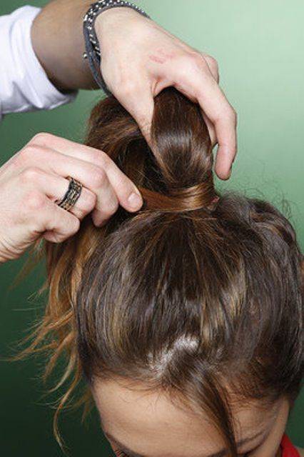 Если под рукой нет бублика, можно заменить его толстой махровой резинкой или несколькими тонкими. Чем более объемным он будет, тем эффектнее получится пучок. Еще один вариант альтернативы бублику – мягкий пояс.