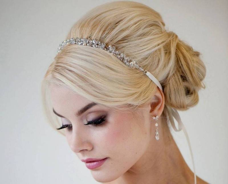 Пучок аккуратно оборачивается повязкой либо можно сплести из него нетугую, тонкую косичку. Такая укладка гармонично смотрится на завитых локонах.