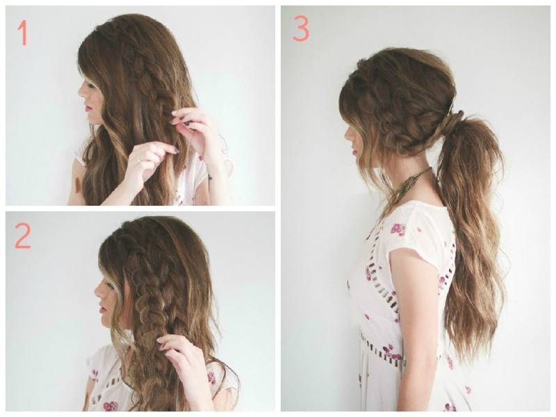 - Заплести оставленный хвост в косу и свернуть, делая с одной стороны пучок.