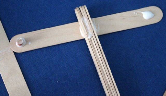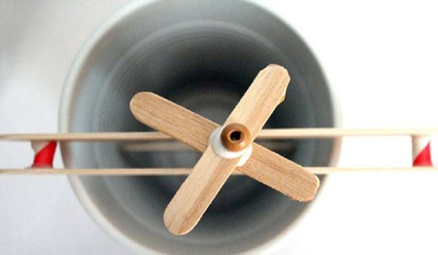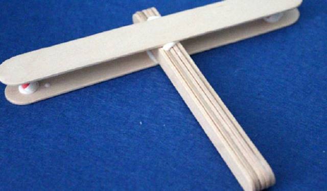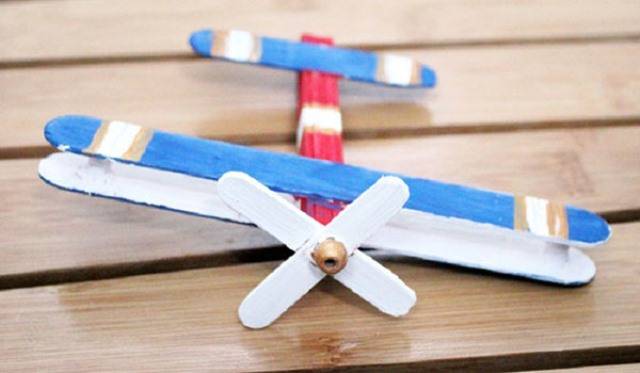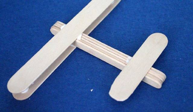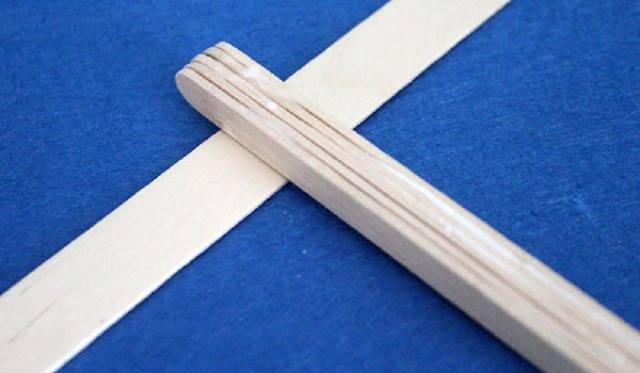 Осталось смастерить пропеллер. Для этого склеиваем между собой поперек две половинки палочек, которые нужно предварительно закруглить. Готовый пропеллер будем крепить при помощи клея к носу самолета после окрашивания.