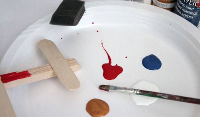 Теперь нужно разукрасить самолетик. Понадобятся гуашевые краски и губка.