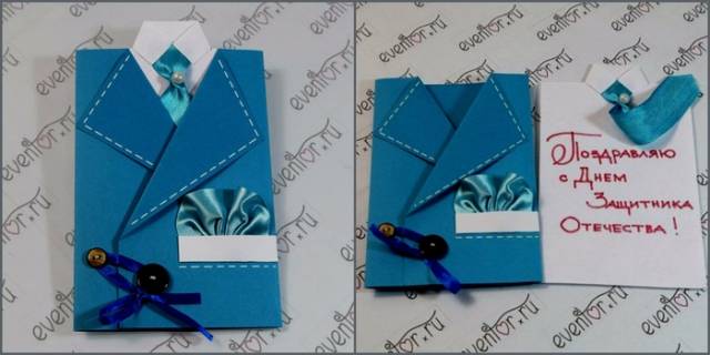 Работы в технике оригами не менее интересны, чем объемные аппликации. Причем можно комбинировать обе техники. Можно сделать интересную открытку в виде мужской рубашки с галстуком, которую оденем в китель.