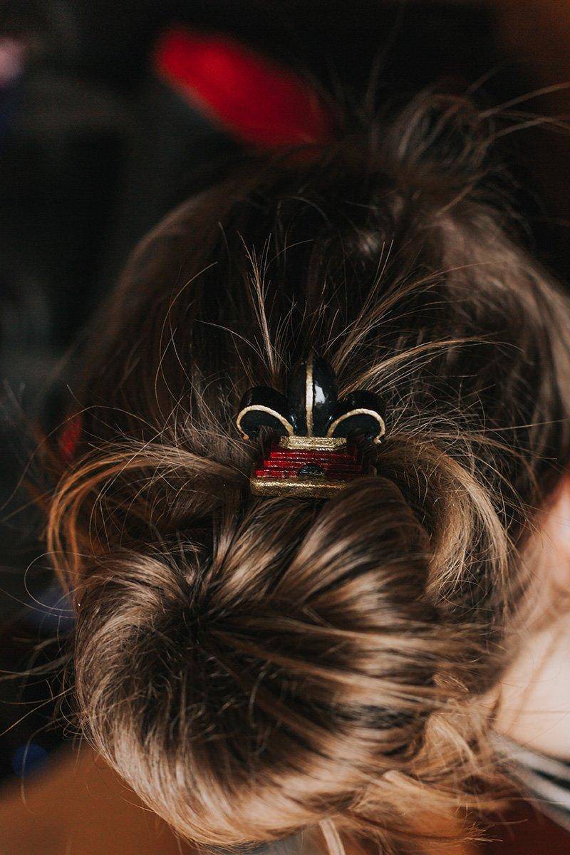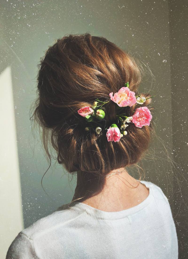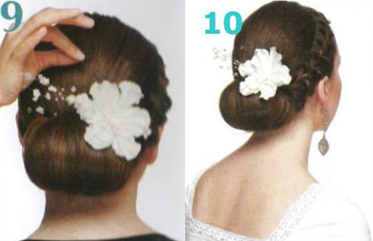 Шаг 9-10. Украсьте пучок декоративным цветком, закрепив его шпилькой.