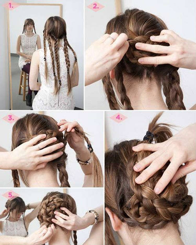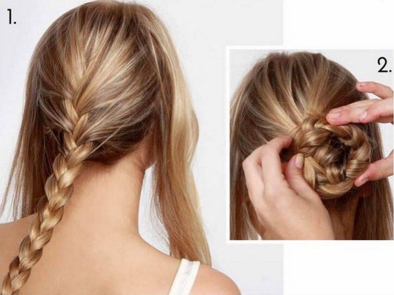 - 2. Начиная с задней косички, начинайте плести пучок. Для этого просто скрутите одну косу вокруг своего основания. Кончики косы можно спрятать в центр пучка. Результат необходимо закрепить шпильками.