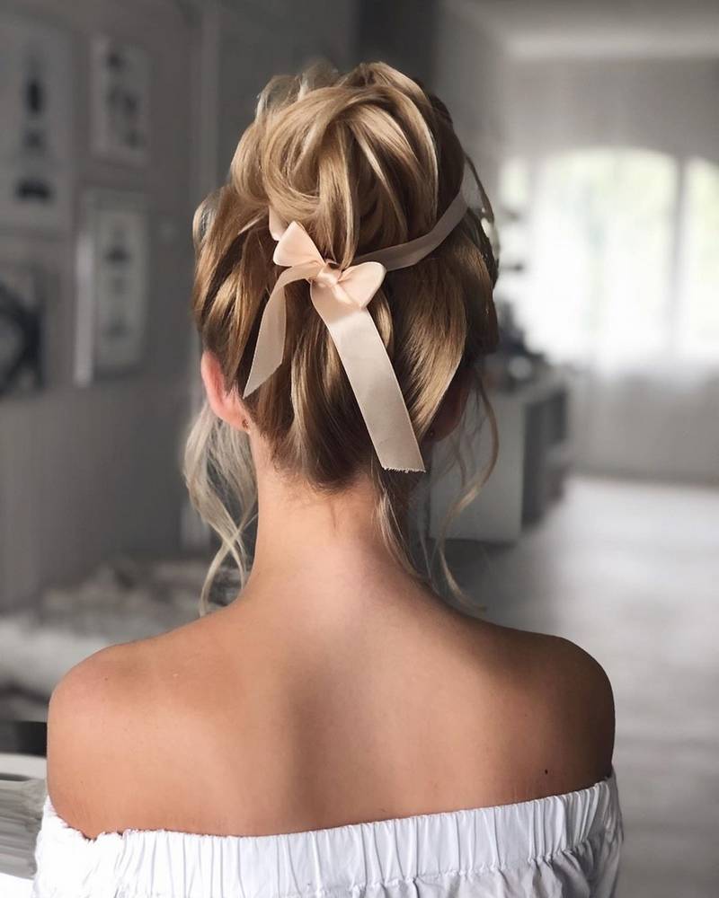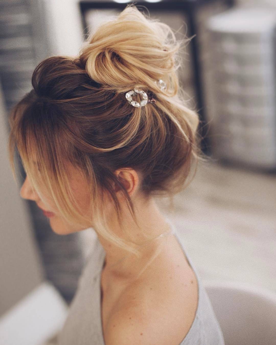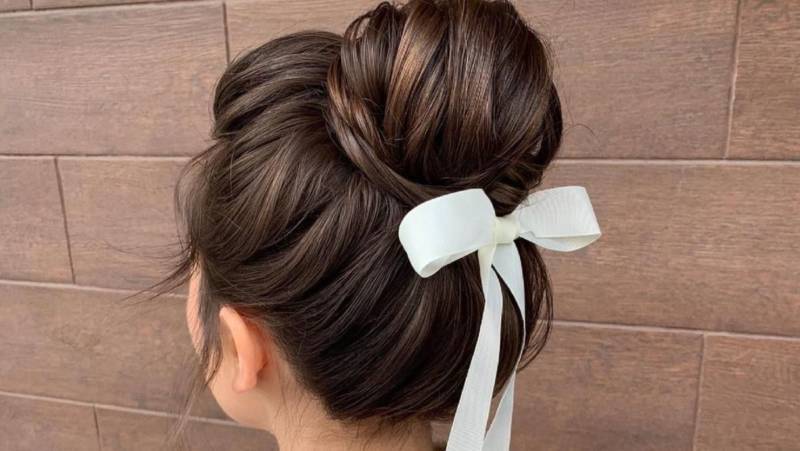 Пучок в сочетании с аксессуарами: ленты, заколки, шпильки и другие элементы