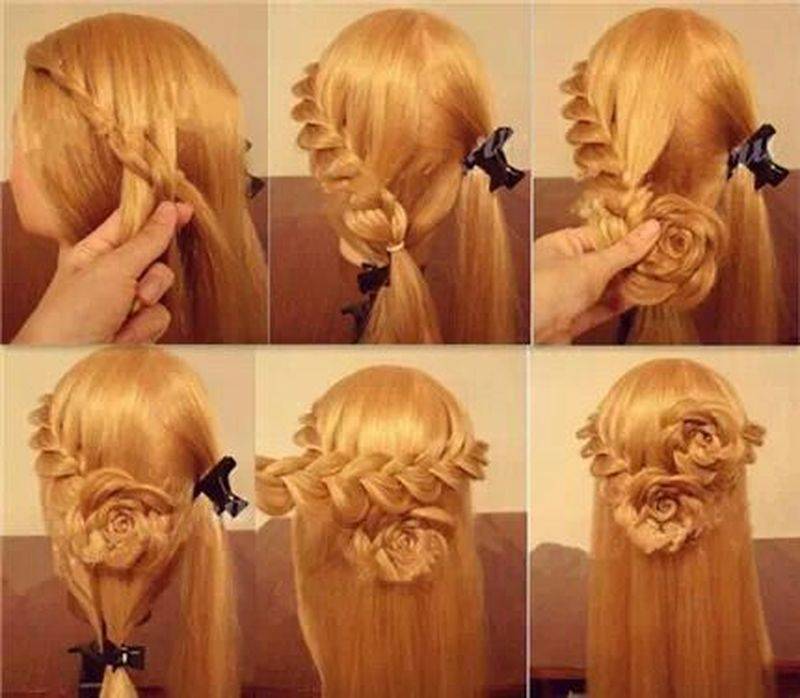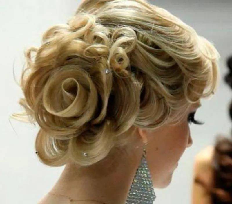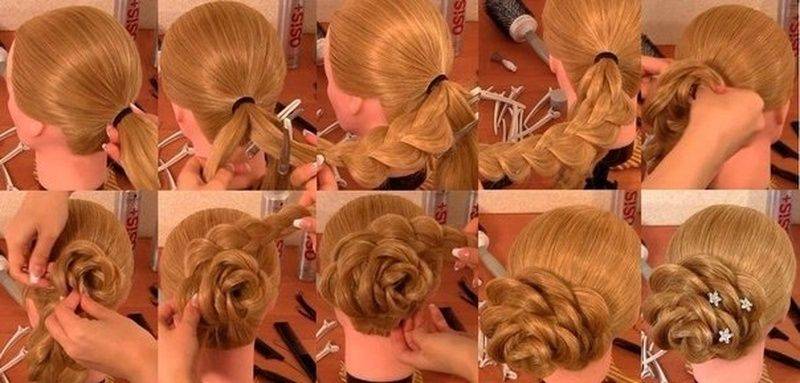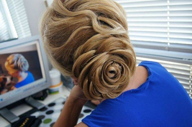 Красочен пучок в виде розы. Вначале распущенные волосы расчесываются и делятся на две части, следом завязывается «узел». Локоном, оказавшимся наверху, создается жгут и оборачивается по кругу «узел», результат закалывается. Нижний локон вторит, только действовать надо уже снизу вверх. Тоже закрепляем шпильками, потому что прическа получается очень хрупкой. Для сохранения пучка «розы» используем большее количество заколок, распылим лак наверху.