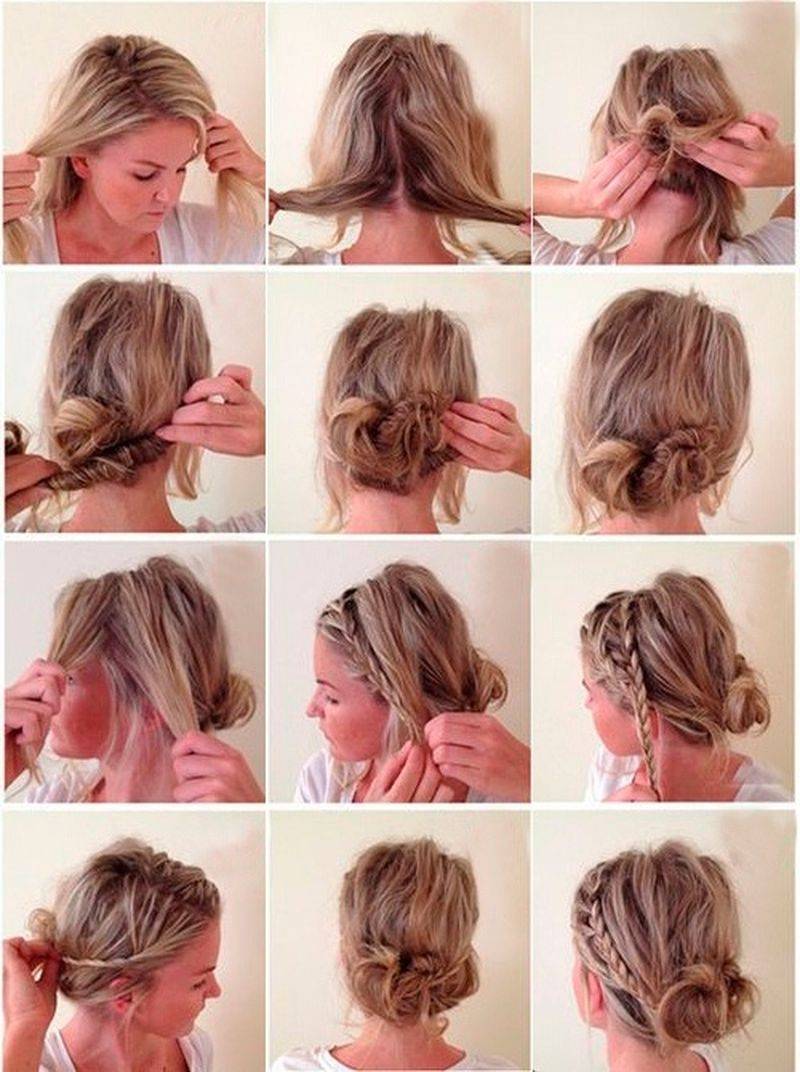 Плетение можно так же сочетать с пучками. К примеру, сопоставить его небрежность с аккуратным «колоском». Благодаря этому, волосы не будут попадать в глаза и мешаться, а вылезшие пряди станут прекрасным дополнением прически. Для ее создания возле лба заплетается «колосок», как следствие, волосы следом собираются в пучок. Образ выглядит целостно и непосредственно.