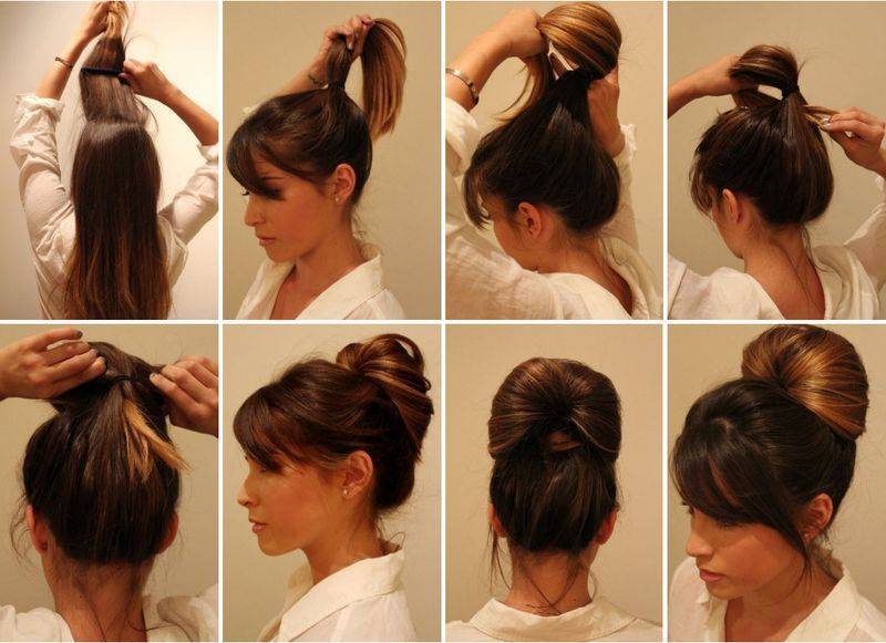 Бабетта – яркий пример того, как можно оформить прическу пучок на длинные волосы в ретро стиле. Для этой укладки важен большой объем, который достигается с помощью валика и начеса. Способов сделать бабетту масса. Самый простой из них, как поэтапно можно выполнить ретро прическу, показан на фото.