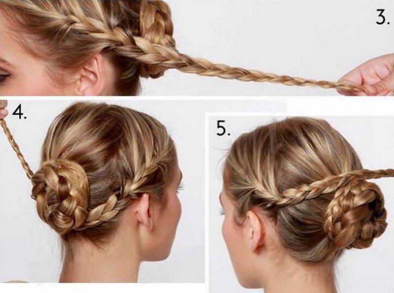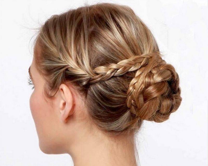 Подобную укладку можно выполнить несколько иначе. Первый шаг действий будет аналогичен предыдущей прическе. После того как пучок сформирован, от верхней части волос нужно будет отделить тоненькую прядку и сплести из нее обычную косичку. Оставшиеся локоны необходимо уложить, обернув их вокруг пучка и зафиксировать. А косичку направить вокруг головы в виде ободка и закрепить невидимкой. Прическа красиво смотрится с пробором посередине.