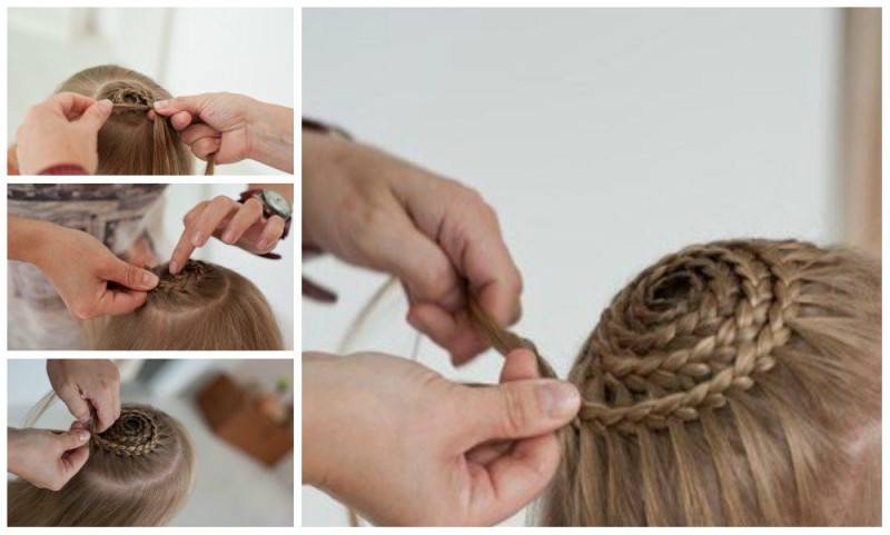 - Отделенную прядь проплетите по кругу так, чтоб коса собиралась к центру прически. В данном случае начало плетения остается неприметным . В неприятном случае велика возможность получить в центре непрезентабельную небольшую «лысину».