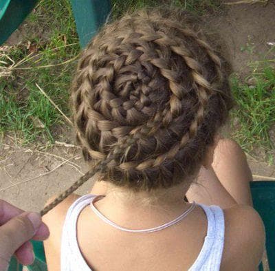 Сделай круг, потом другой… Косичка «Улитка» в первом круге должна быть как бы стянута к макушке, чтобы в центре прически не образовалась некрасивая залысина. После того, как полный круг будет завершен, уберите один из зажимов, удерживающих шевелюру по бокам, и начинайте формировать второй виток косички
