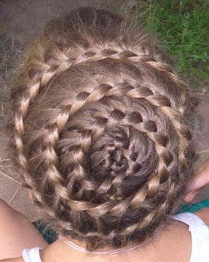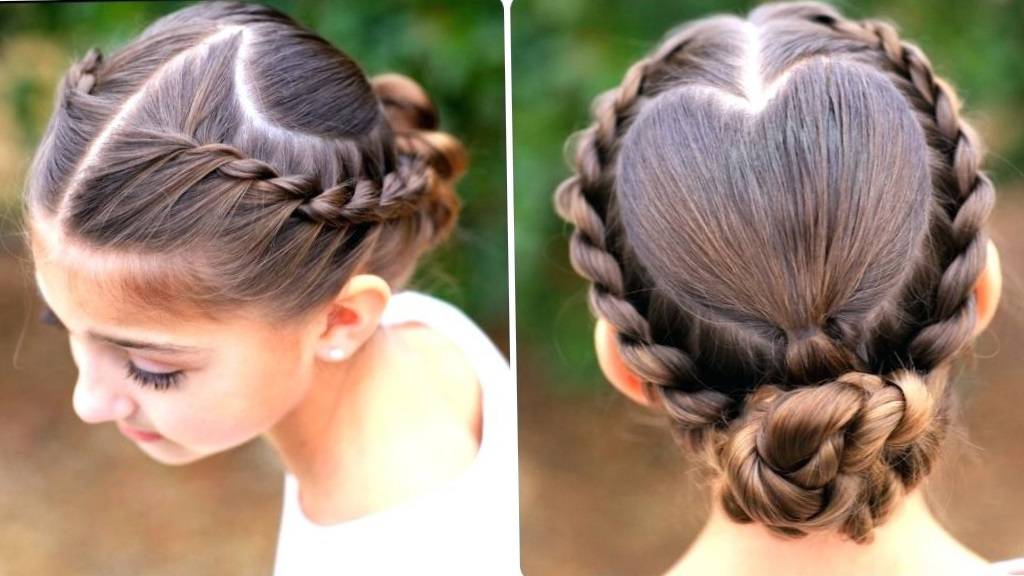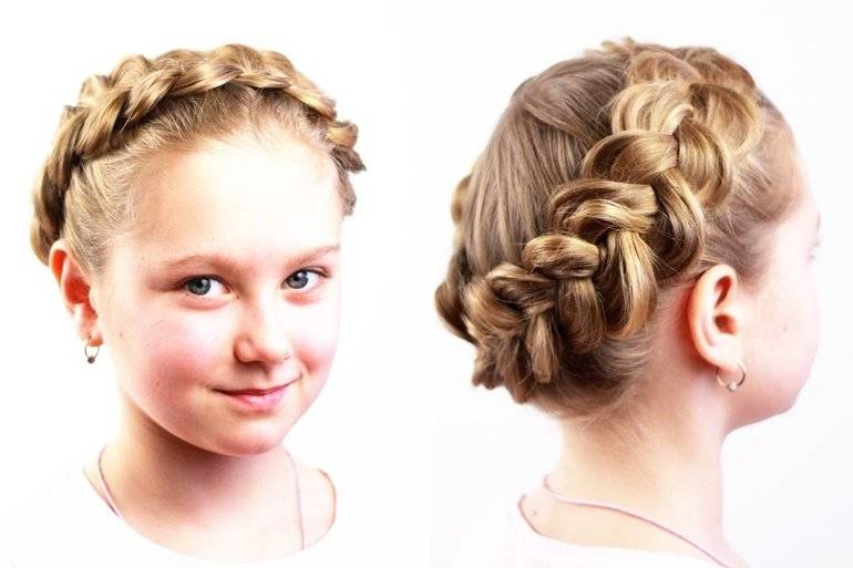 С косами. Эта прическа выглядит очень нарядно. Создать ее очень просто, если немного потренироваться. В основе прически положена коса, создание которой происходит по спирали. Лучше всего выполнять укладу на прямых волосах. Но если у вашей девочки кудрявая шевелюра, то можно усмирить ее при помощи пенки. Для начала предстоит выделить центральную прядь на макушке и поделить ее на 2 части.