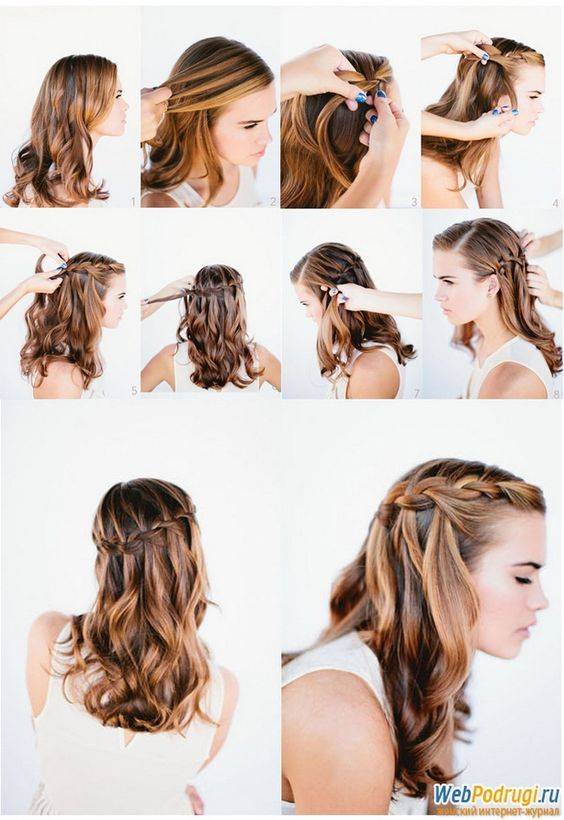 - Как вариант можно сделать водопад. При этом делается 3 хвостика, каждый из которых заворачивается. При этом первый делается без подбора нижних локонов, а остальные с подбором.