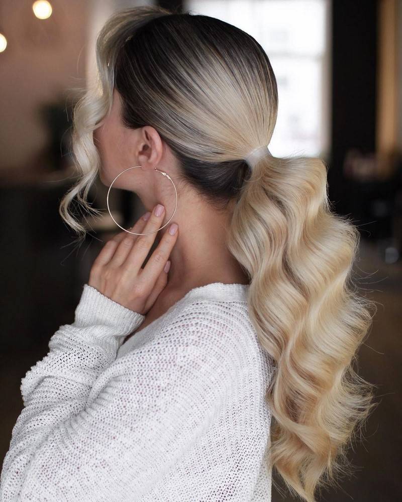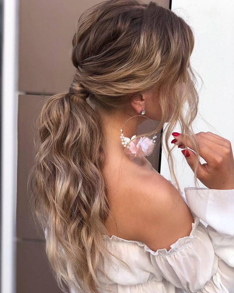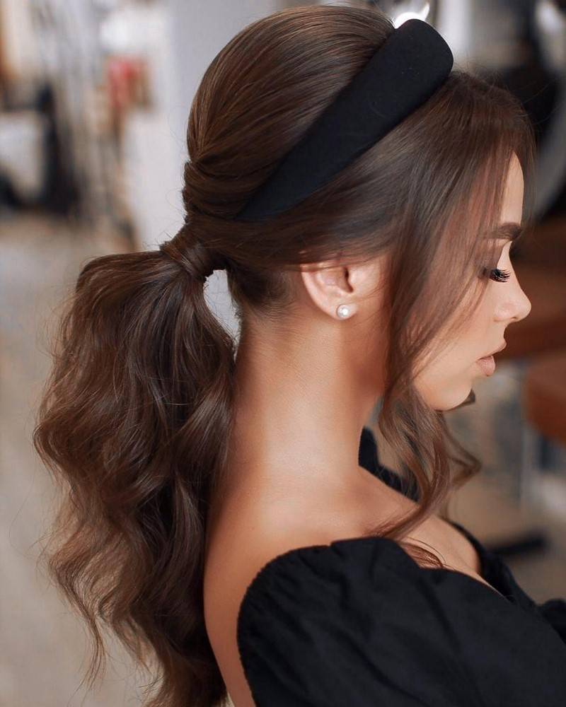 - Нарядный высокий хвост с прямым или вьющимся типом прядок