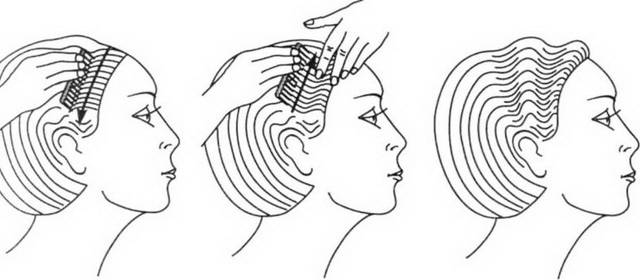 - Поперечные волны выполняются перпендикулярно (поперек) воображаемому пробору, начиная от лица и продвигаясь к затылку.
