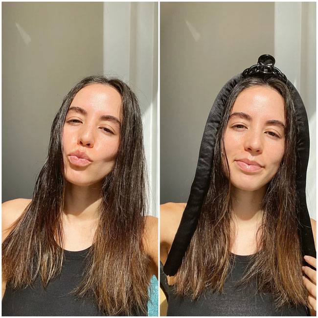 Идея состоит в том, чтобы снять пояс с халата и надеть его на макушку так, чтобы концы свисали с каждой стороны. Затем оберните пряди влажных волос вокруг пояса и закрепите внизу резинками. Когда вы проснетесь на следующее утро, аккуратно снимите резинки и распустите волосы. Вы получите красивые локоны.