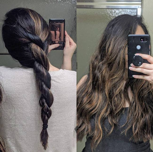 Если волосы пушатся, обработайте их воском или гелем. Косички подходят для прямых от природы локонов. Метод быстрый, а эффект красивый. От вас зависит, хотите ли вы получить толстые, нежные или крошечные волны. В зависимости от того, что вы выберете — одну, две, три косички, вы получите такой эффект.