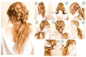 Сделать оригинальную простую прическу своими руками сейчас не представляет никакого труда. Обилие средств для стайлинга, различных аксессуаров и заколок для волос позволяет нам творить что угодно на своей голове и создавать за 5 минут прически хоть на каждый день, хоть вечерние. Длина волос тоже особой роли не играет. Хотите заплести косу на короткие волосы. Пожалуйста! Используйте маленькие силиконовые резиночки, которые надежно зафиксируют пряди и они не разлетятся в течение дня. Принцип плетения смотрите на фото ниже.