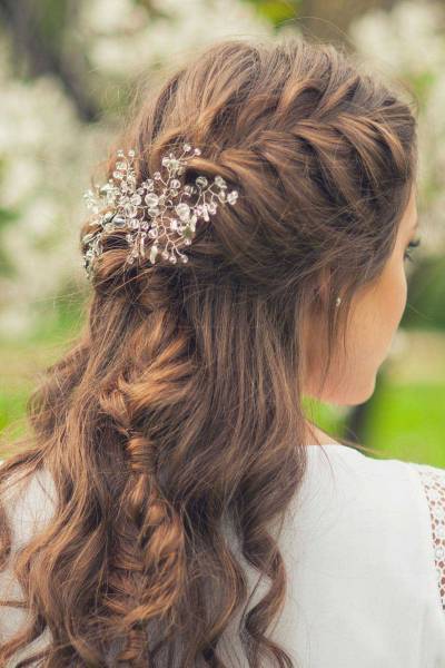 - Большую, слегка растрепанную рыбью косу заплети и обыграй аксессуаром как центральный элемент прически.