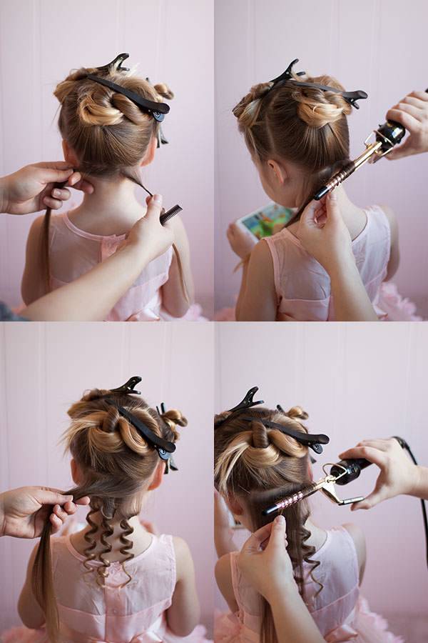 Сухие волосы убираем наверх. Работу начинаем с самых нижних прядей, накручивая их на плойку по спирали. Как мы уже писали, у девочек тонкие волосинки, поэтому есть соблазн накрутить весь слой целиком, но делать этого не стоит. Разделяйте слои на 3-4 части.