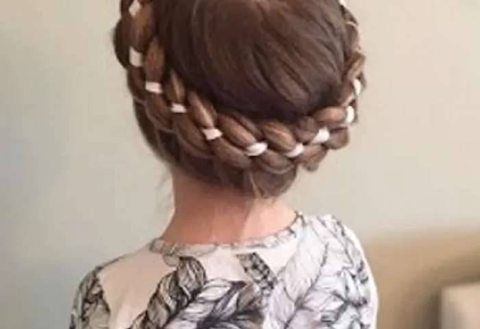 Яркая и нежная прическа не отличается сложностью исполнения. Она придаст утонченность и изысканность маленькой сказочной принцессе. Вот последовательность создания этой укладки: расчесав волосы, надо взять три пряди у лица и начать плетение французской косы вокруг головы с подхватом прядей. Когда все волосы будут задействованы, доплести косичку обычным способом, располагая ее далее по кругу. Кончик ее можно спрятать под плетение для более аккуратного вида укладки. Закрепить созданную прическу следует с помощью лака. Для дополнения образа можно разнообразить укладку маленькими бусинками, нежными заколками.