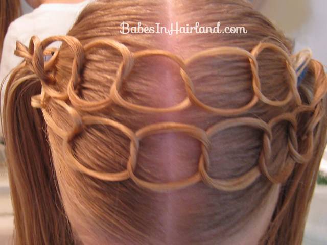 Хвостики в технике вязания. С помощью тонких эластичных резинок скрепить хвостики вместе и соединить их со следующей парой так, чтобы получился перекрестный орнамент. Концы можно оставить свободными, заплести в традиционную или рыбную косичку, сформировать в пучок.
