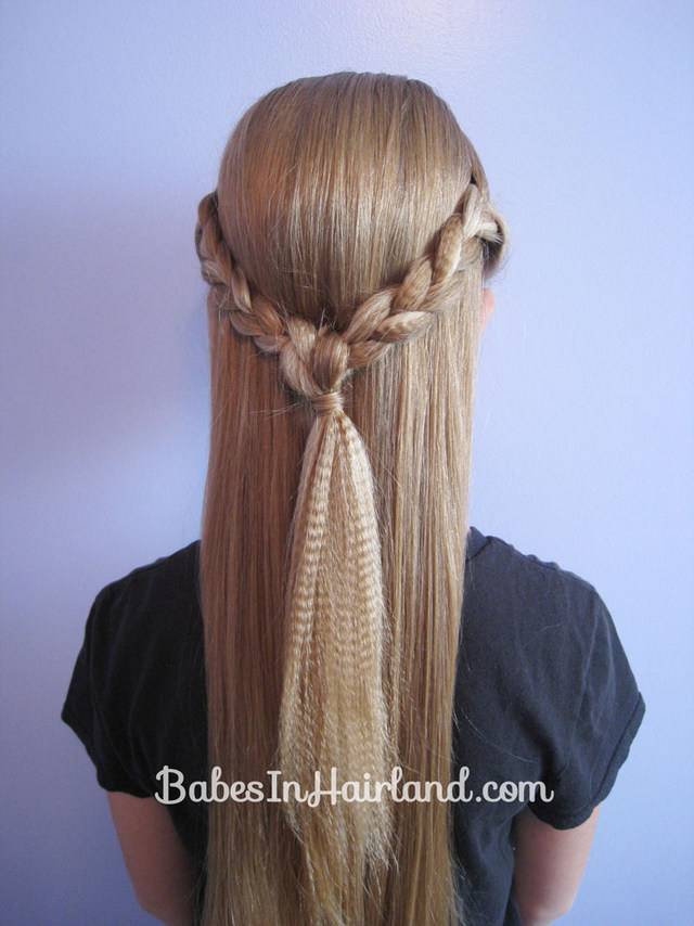 Косы сводим на затылке, снимаем одну из резинок, а второй фиксируем плетение. Свободной прядью обматываем конструкцию, чтобы ничто не резало глаз.