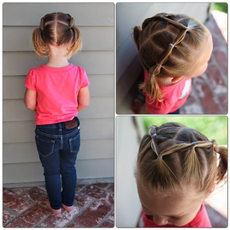 Из тонких хвостиков можно создать оригинальный узор напоминающий паутинку. Для этого можно разделить волосы на де равные части и заплести как на фото прически для детского сада.