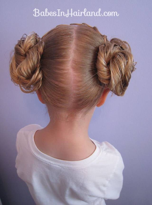 Третий вариант: разделить волосы на две части и завяжите высокие хвостики. Начесать и скрутить пучки.