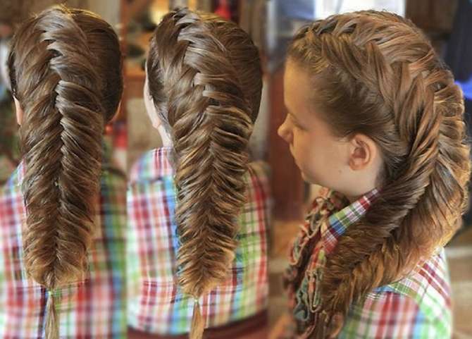 Техника «рыбий хвост» позволяет максимально убрать длину волос. Шевелюру собирают в высокий хвостик, делят на две части. С каждой из сторон берут по прядке, перемещая ее в противоположную зону.
