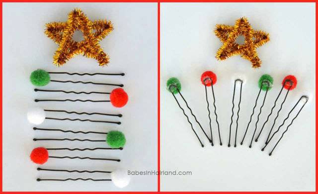 Теперь понадобится декор для нашей “елочки”. Лучше, если шпилек будет больше 3 — так они не будут выглядеть случайными. Закалывать их нужно в основание “ствола”, то есть в то место, которое зафиксировано резинкой.