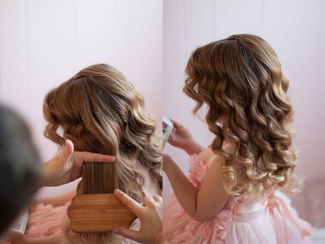Часто самые любимые детские прически для девочек — с раскинутыми по плечам кудрями. Чтобы сделать такую укладку, понадобится занять маленькую непоседу миниум на полчаса, ведь придется неподвижно сидеть, пока вы будете управляться с плойкой.