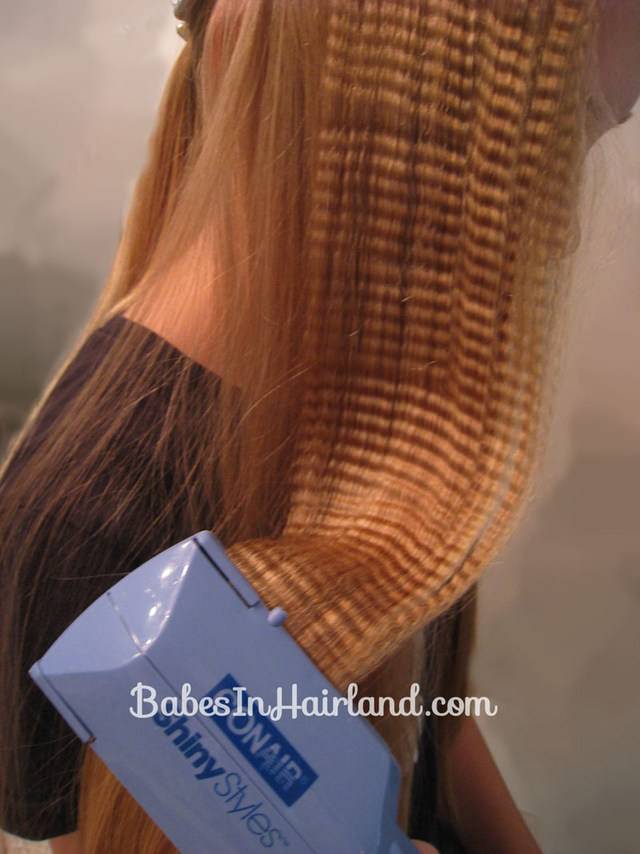 Центральную часть временно откладываем. Теперь обрабатываем плетение и кончики ниже резинки плойкой (если вам так удобнее — можно сначала сделать пряди гофрированными и только потом заплетать).