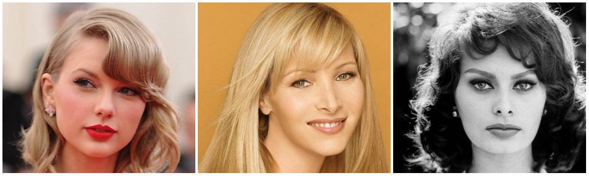 Треугольной формой лица обладают известные актрисы Скарлетт Йоханссон, Риз Уизерспун, Кристина Риччи. Широкий лоб и узкий подбородок у певицы Рианны и модельера Виктории Бэкхем. С помощью объёмных причёсок Каре, Боб, различных способов визуализации женщины уравновешивают эти части и достигают почти совершенных очертаний.