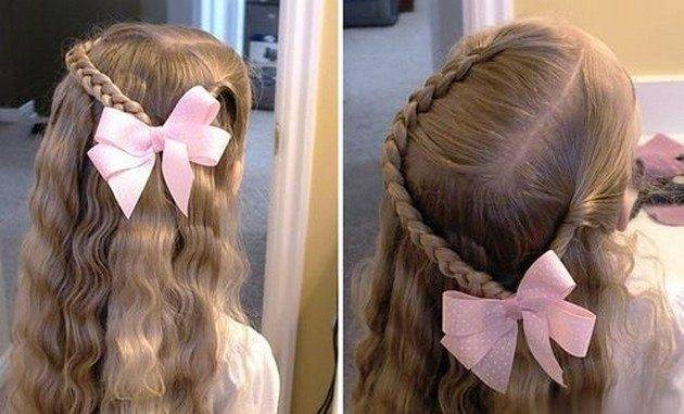 Простой и быстрый вариант заключается в плетении двух косичек и закреплении на концах бантов. Разнообразить такие красивые прически на первое сентября для девочек можно обратным плетением или французской косой. Последний способ не является практичным, так как к концу праздника косичка может начать пушиться. Другим вариантом прически на 1 сентября можно назвать диагональную косу по всей голове с вплетенными в нее лентами. Цвет лент должен в точности соответствовать оттенку блузки и других аксессуаров. Белоснежные банты будут выглядеть слишком ярко на фоне блузки цвета айвори. В качестве девчачьей прически на 1 сентября для длинных волос можно использовать элементы из тонких косичек, переплетенных между собой подобно рыболовной сетке.